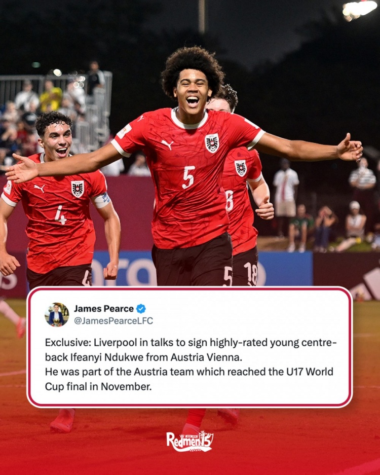 潜力股!TA:利物浦商谈引进奥地利维也纳17岁中卫恩杜克韦