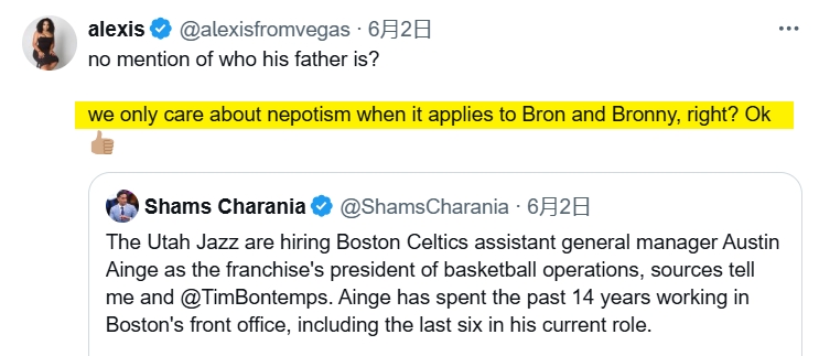 06月04日讯 据ESPN名记Shams Charania和Tim Bontemps联合报道,多位消息人士透露,爵士聘请奥斯汀-安吉担任篮球运营总裁。值得一提的是,奥斯汀-安吉是爵士CEO丹尼-安吉的儿子,在Shams的报道中,他并没有指出这一父子关系;媒体人Alexis就批评Shams说:“不提他的爸爸是谁?所以我们只在勒布朗和布朗尼身上才谈论‘裙带关系’是吗?OK”